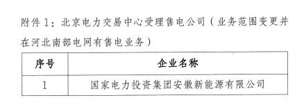 河北發(fā)布了《關(guān)于售電公司公示結(jié)果的公告》北京推送的1家售電公司