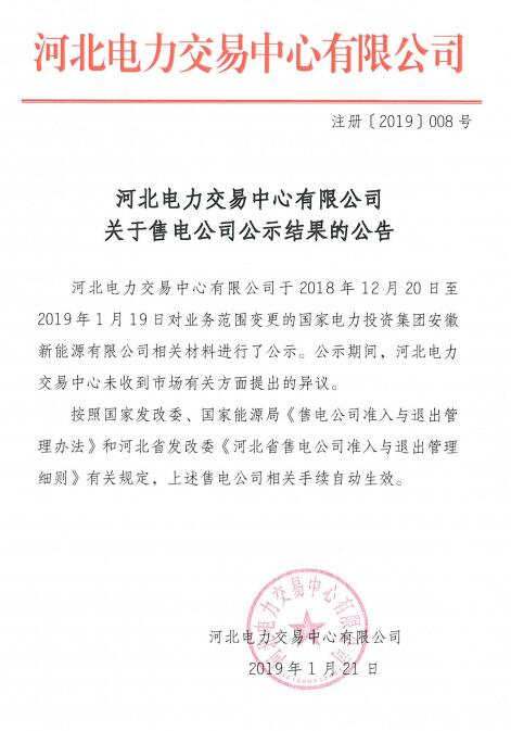 河北電力交易中心日前發(fā)布了《關(guān)于售電公司公示結(jié)果的公告》,申請業(yè)務(wù)范圍變更的國家電力投資集團安徽新能源有限公司相關(guān)手續(xù)生效。