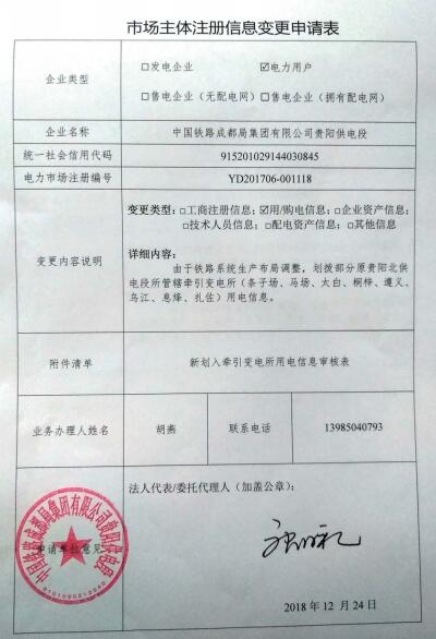 因凱里產(chǎn)投聚源配售電有限公司、粵電貴州電力銷(xiāo)售有限公司、貴州惠燃能源科技有限公司、貴州華網(wǎng)電力銷(xiāo)售有限公司、成都鐵路局貴陽(yáng)北供電段、成都鐵路局貴陽(yáng)供電段、國(guó)電貴州能源銷(xiāo)售有限公司、貴州電網(wǎng)有限責(zé)任公司安順市郊供電局、貴州電網(wǎng)有限責(zé)任公司安順鎮(zhèn)寧供電局等9家市場(chǎng)主體提出注冊(cè)信息變更申請(qǐng),按照《貴州省電力中長(zhǎng)期交易規(guī)則(試行)》(黔監(jiān)能市場(chǎng)〔2017〕112 號(hào))、《貴州省電力市場(chǎng)主體注冊(cè)管理辦法》(黔電交易〔2018〕154號(hào))相關(guān)規(guī)定,以上9家市場(chǎng)主體提交注冊(cè)信息變更資料通過(guò)貴州電力交易中心初步審核。