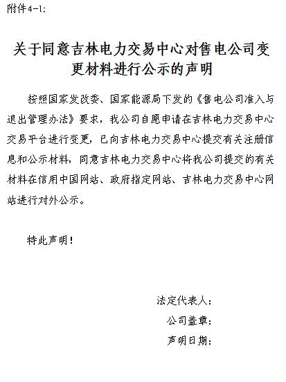 1.關(guān)于同意吉林電力交易中心對售電公司變更材料進(jìn)行公示的聲明(原件);
