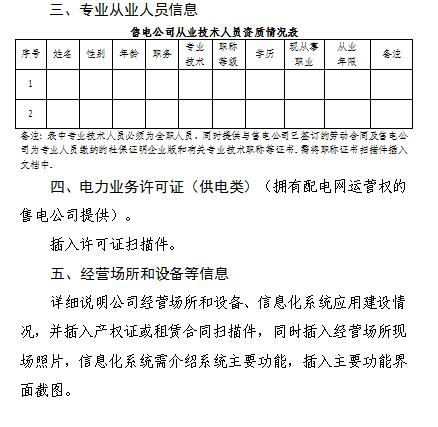 6. 公示信息材料需按照附件6公示信息模板編寫,需將相關(guān)掃描文件插入到WORD文檔中,最后形成完整文檔(填寫公示材料中的經(jīng)營場所和設(shè)備等信息時,既要有文字描述,同時要插入場所證明、售電業(yè)務(wù)信息管理或客戶服務(wù)平臺登錄界面及相關(guān)功能界面截圖)。
