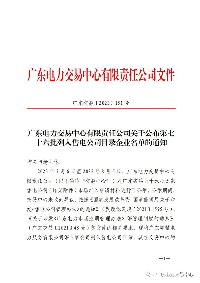 廣東公布第七十六批列入售電公司目錄企業(yè)名單