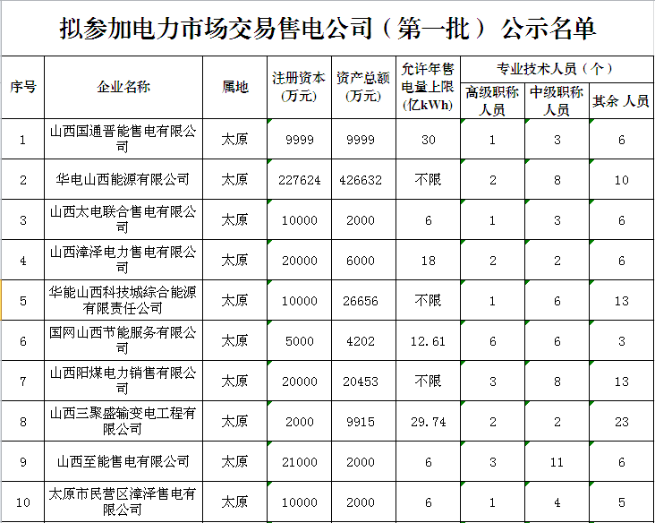 山西近日發(fā)布了擬參加電力市場交易售電公司名單(第一批)的公示,首批名單共50家售電公司,詳情如下:關(guān)于擬參加電力市場交易售電公司名單(第一批)的公示依據(jù)國家發(fā)展改革委 國家能源局《關(guān)于印發(fā)電力體制改革配