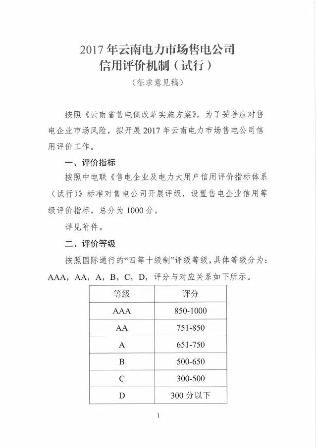 《2017年云南電力市場售電公司信用評價機(jī)制(試行)(征求意見稿)》