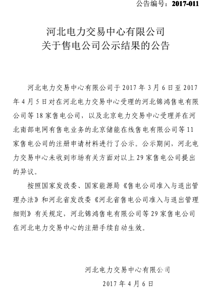 河北電力交易中心有限公司關(guān)于售電公司公示結(jié)果的公告(2017-011)