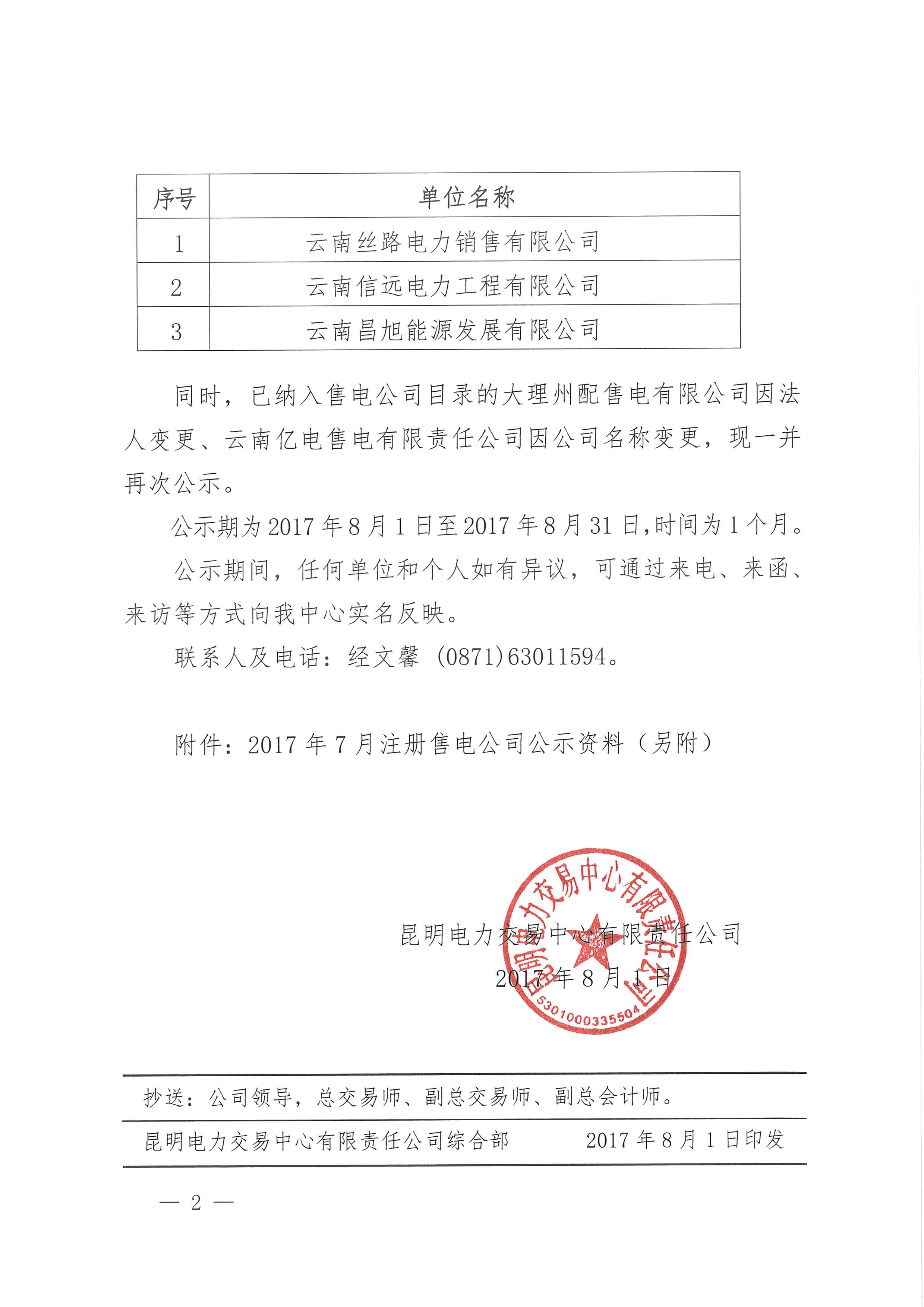 昆明電力交易中心關(guān)于公示2017年7月注冊(cè)售電公司的公告
