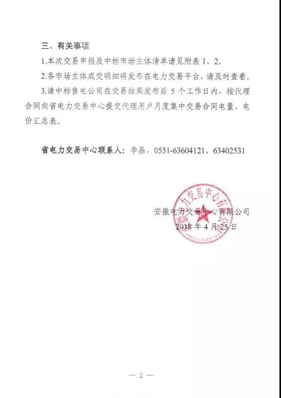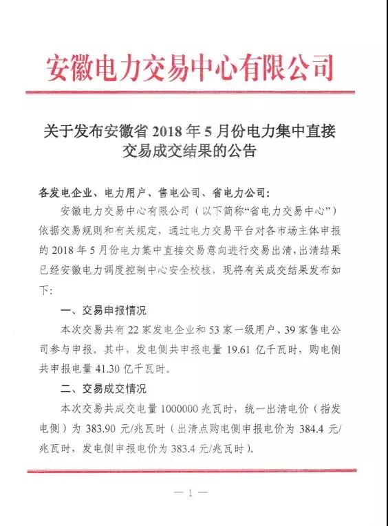 安徽電力交易中心日前發(fā)布了《安徽省2018年5月份電力集中直接交易成交結(jié)果的公告》,公告中稱,本次交易共成交電量1000000兆瓦時(shí),統(tǒng)一出清