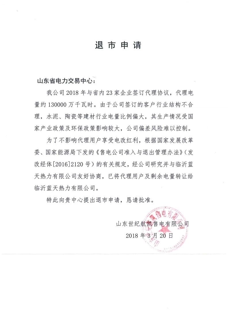 5月21日,山東電力交易中心發(fā)布了山東世紀航凱售電有限公司自愿退出電力市場的公示公告,這距離廣東售電公司退出事件僅一個星期,正如我們所預(yù)見的一樣,這樣的退出公司會越來越多。
