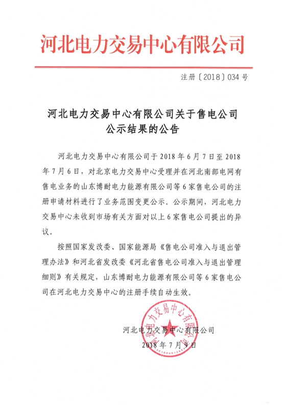 河北電力交易中心發(fā)布了北京電力交易中心推送的6家售電公司公示結(jié)果的公告,對北京電力交易中心推送的山東博耐電力能源有限公司等6家售電公