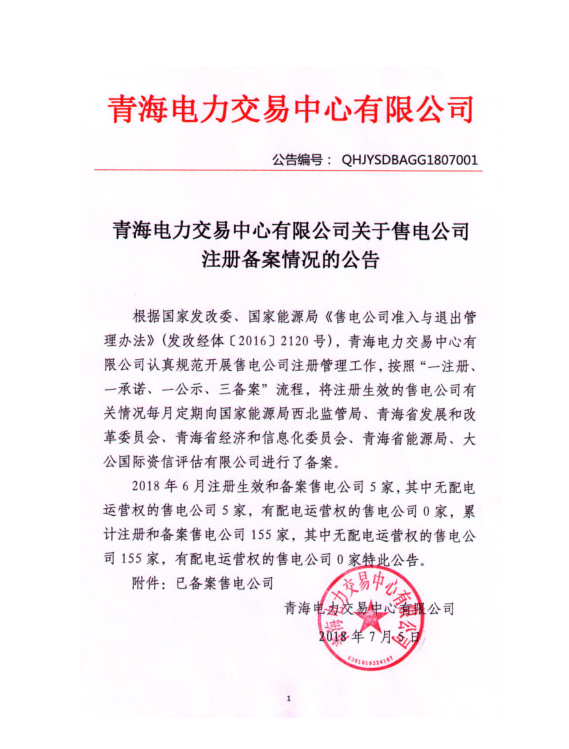 青海電力交易中心日前發(fā)布了《青海電力交易中心有限公司關(guān)于2018年7月售電公司注冊(cè)備案情況的公告》,2018年6月注冊(cè)生效和備案售電公司5家