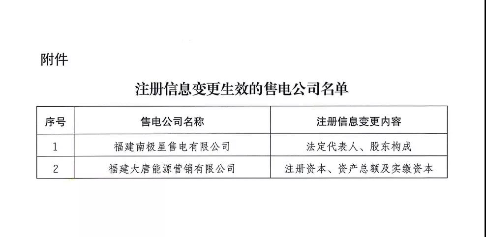 福建電力交易中心有限公司關(guān)于福建南極星售電有限公司等注冊信息變更生效的公告