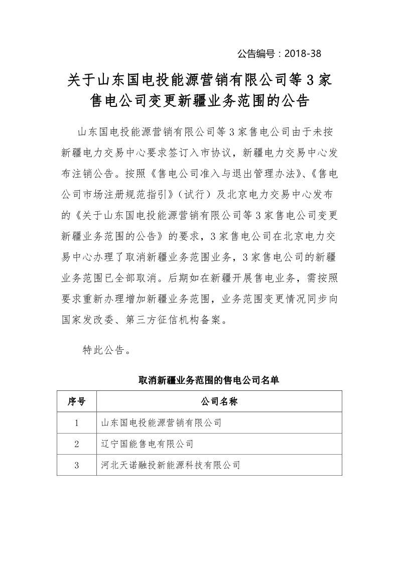 北京電力交易中心日前發(fā)布了《關(guān)于山東國電投能源營(yíng)銷有限公司等3家售電公司變更新疆業(yè)務(wù)范圍的公告》,山東國電投能源營(yíng)銷有限公司等3家售