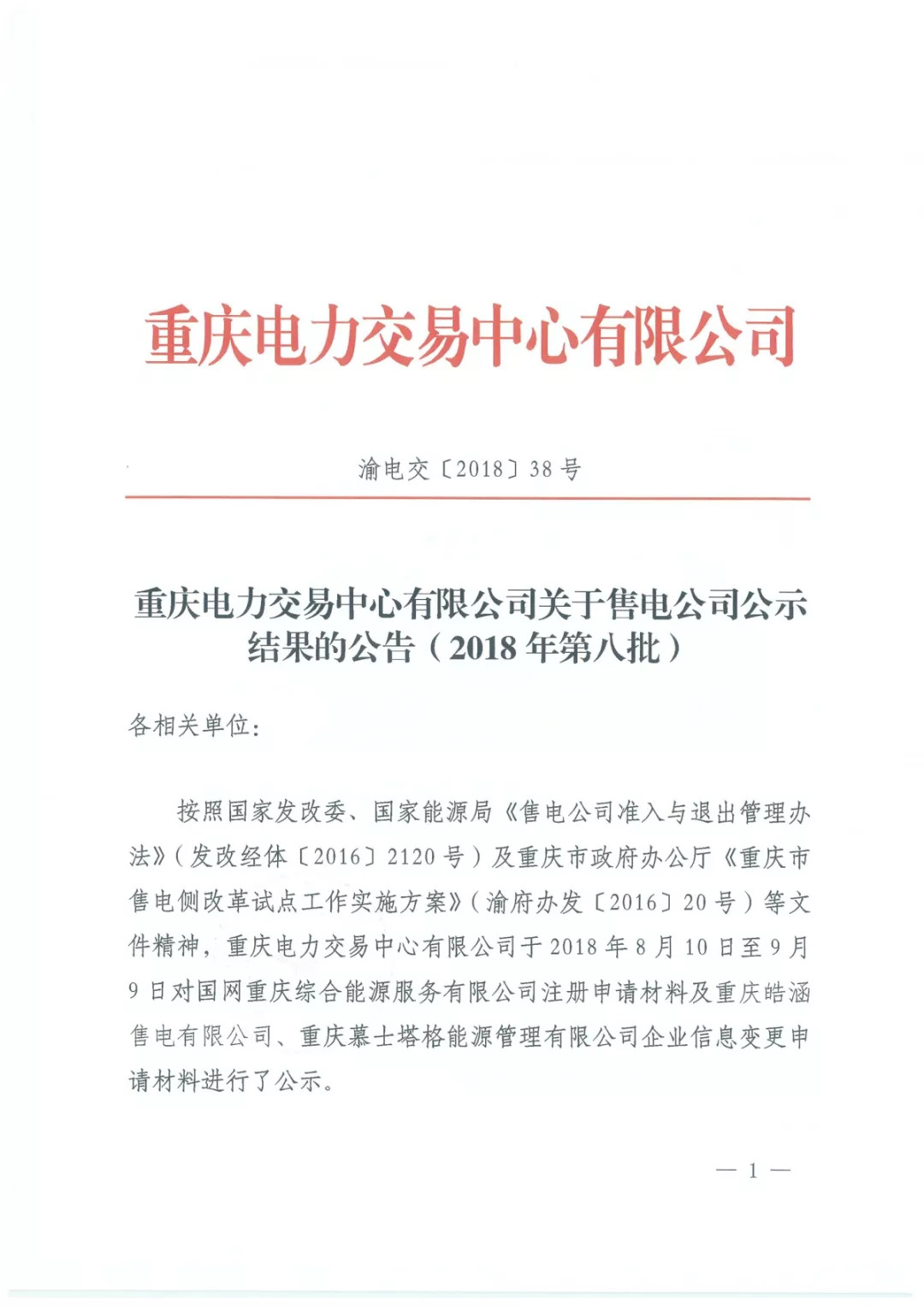 重慶電力交易中心日前發(fā)布了《關(guān)于售電公司公示結(jié)果的公告(2018年第八批)》,于2018年8月10日至9月9日對(duì)國網(wǎng)重慶綜合能源服務(wù)有限公司注冊(cè)申請(qǐng)材料及重慶皓涵售電有限公司、重慶慕士塔格能源管理有限公司企業(yè)信息變更申請(qǐng)材料進(jìn)行了公示。