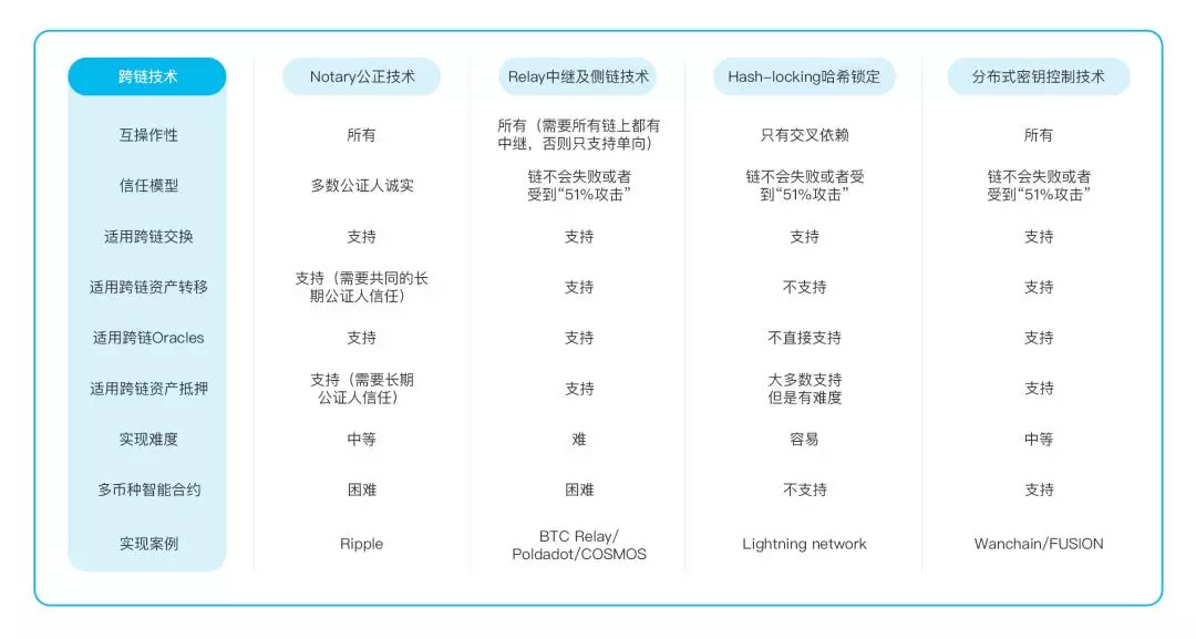 目前主流的跨鏈技術(shù)包括:1、公證人機制(Notary schemes)2、側(cè)鏈/中繼(Sidechains/relays)3、哈希鎖定(Hash-locking)4、分布式私鑰控制(Distributed private key control)