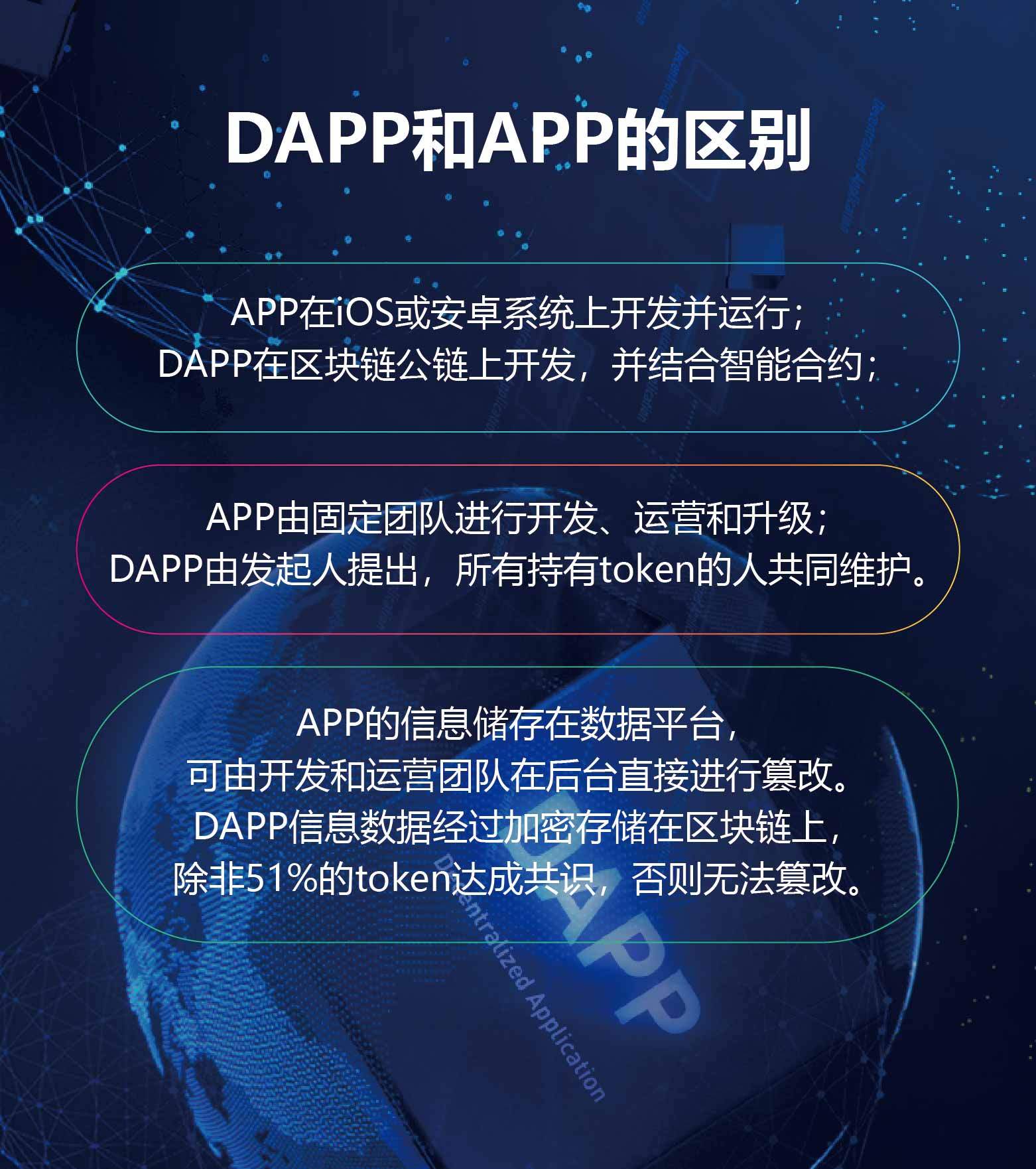 DAPP是Decentralized Application的縮寫,翻譯過來就是去中心化應用,也稱為分布式應用。相較于我們熟悉的APP,DAPP不依賴于iOS和Android系統(tǒng)開發(fā),而是放在區(qū)塊鏈系統(tǒng)上,并且結(jié)合了智能合約。DAPP于區(qū)塊鏈,就好比APP之于iOS和Android。