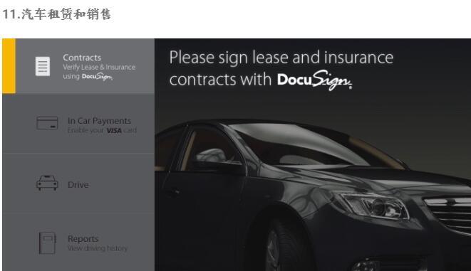借助Visa-DocuSign工具,潛在客戶可以選擇他們想租賃的汽車,并將交易記錄在區(qū)塊鏈的公共分類賬上。然后,從駕駛員座位上,客戶簽署租賃協(xié)議和保險單,區(qū)塊鏈更新為該信息。