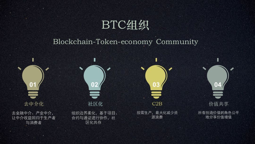 5、基于Token 的分布式協(xié)作組織——BTC組織的四大特征是去中介、社區(qū)化、C2B及價(jià)值共享。