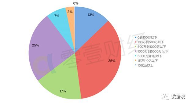 注冊資本在0到100萬的公司占13%,100萬到500萬與1000萬到5000萬的占比較大,分別為35%和25%,兩者的和占到全部的一半多,500萬到1000萬的占到了17%。