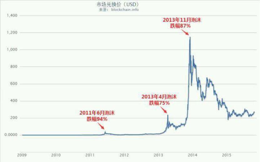 ●2013年11月,比特幣價(jià)格接近1200美元,這是一個(gè)心理上的重要關(guān)口,在觸及這一關(guān)口后比特幣開始了總共411天的回調(diào)之旅,這也部分促使了交易所Mt.Gox的崩潰,5億美元資金蒸發(fā),到2015年1月比特幣跌至150美元的低位,當(dāng)時(shí)比特幣大跌87%。