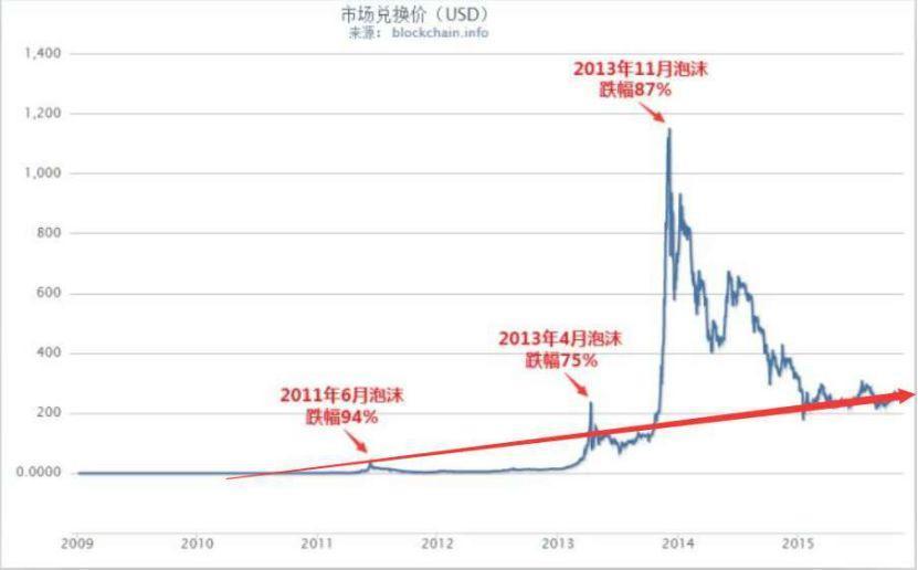 這個(gè)規(guī)律就是:比特幣每次在熊市都會(huì)跌去大概70%到90%,而每次跌的最低點(diǎn),都會(huì)比上一次的最高點(diǎn)要高,而下一次的最高點(diǎn),你會(huì)比這一次的最高點(diǎn)高出3到5倍左右,我們把這種規(guī)律,稱為數(shù)字貨幣的螺旋上升定律。