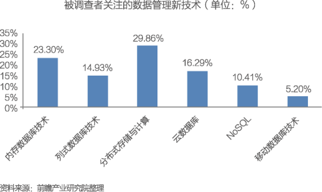如下圖所示,分布式存儲與計算成為最受關(guān)注的數(shù)據(jù)管理新技術(shù),比例達(dá)到29.86%;其次是內(nèi)存數(shù)據(jù)庫技術(shù),占到23.30%;云數(shù)據(jù)庫排名第三,比例為16.29%。此外,列式數(shù)據(jù)庫技術(shù)、NoSQL也獲得較多關(guān)注。從調(diào)查結(jié)果來看,以Hadoop為代表的分布式存儲與計算已成為人們心目中大數(shù)據(jù)的關(guān)鍵技術(shù)。以SAP HANA為代表的內(nèi)存數(shù)據(jù)庫技術(shù)和以SQL Azure為代表的云數(shù)據(jù)庫技術(shù),也將成為占據(jù)重要地位的數(shù)據(jù)管理創(chuàng)新平臺。