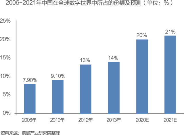 中國數(shù)據(jù)信息量更是以高于全球的增速在發(fā)展,數(shù)字信息量占全球比例已經(jīng)從2006年的7.9%提升至2010年的9.1%,2013年,占比提升至14%,前瞻預(yù)測到2020年,中國在全球數(shù)字世界中所占的份額將增至21%。