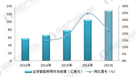 隨著LED燈應(yīng)用的增加和互聯(lián)網(wǎng)、智能技術(shù)的發(fā)展,全球智能照明行業(yè)將迎來新的發(fā)展。2013-2017年,全球智能照明市場規(guī)模逐年增加,以2016年增速最快。2013年時全球智能照明市場行業(yè)規(guī)模約57.57億美元,其中燈具和相關(guān)配件市場規(guī)模約為12.87億美元;2015年全球智能照明市場規(guī)模達(dá)到78.3億美元,至2016年市場規(guī)模增加34.79%至105.5%。占全球LED照明市場規(guī)模的30%以上。雖然目前智能照明市場偏小,不過未來在廠商積極推動以及節(jié)能趨勢帶動下,市場將持續(xù)成長,前瞻估算2017年全年全球智能照明市場規(guī)模可達(dá)129.16億美元。