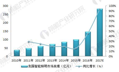 圖表4:2010-2017年中國智能照明行業(yè)產(chǎn)值規(guī)模(單位:億元,%)