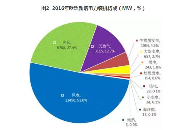 2016年歐盟新增電力裝機(jī)中的21.1GW是可再生能源裝機(jī),占到新增裝機(jī)的86%。這是歐盟連續(xù)第九年可再生能源裝機(jī)在新增裝機(jī)的比例超過(guò)55%。