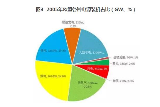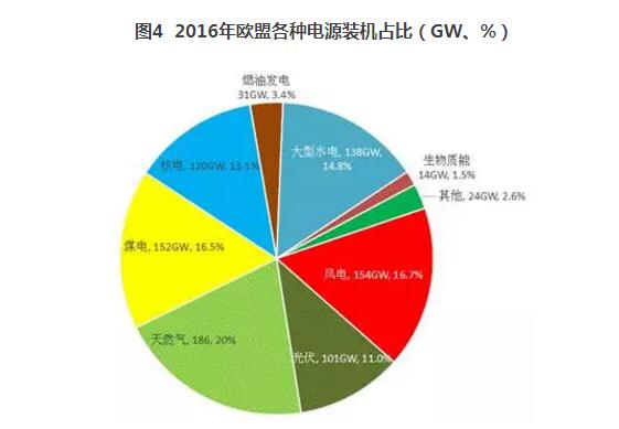 從2000年以后到2016年底,風(fēng)電累計(jì)安裝了142.6GW,光伏安裝了101.2GW,天然氣累計(jì)安裝了98.5GW;同時(shí)燃油發(fā)電、煤電和核電裝機(jī)分別減少了37.6GW、37.3GW和15.5GW。歐盟的電力裝機(jī)結(jié)構(gòu)還將繼續(xù)減少燃油、煤電和核電的裝機(jī),同時(shí)增加風(fēng)電、光伏以及其他可再生能源的裝機(jī)。同時(shí)天然氣裝機(jī)仍然保持這歐盟電力裝機(jī)量第一的位置,2000年以后天然氣新增裝機(jī)了93.5GW。
