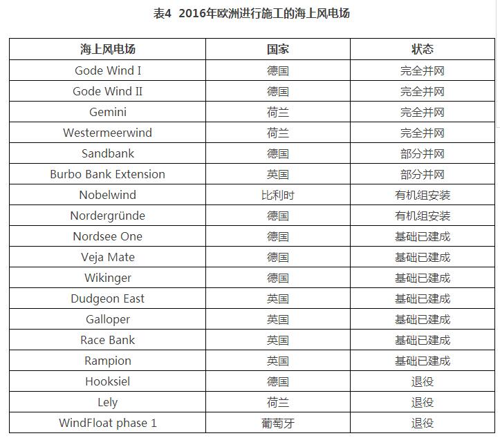2016年歐洲共有4個(gè)海上風(fēng)電場(chǎng)完工。另有11個(gè)累計(jì)4.8GW位于德國(guó)、比利時(shí)、荷蘭和英國(guó)的海上風(fēng)電場(chǎng)處于施工狀態(tài)。