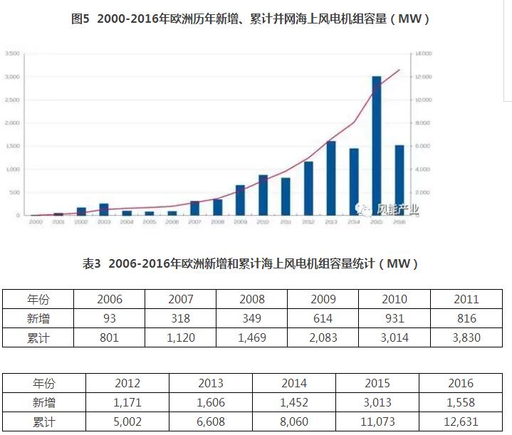 2016年,歐洲新增吊裝海上風(fēng)電機(jī)組367臺(tái),退役5臺(tái),凈增吊裝361臺(tái)。退役的5臺(tái)海上風(fēng)電機(jī)組分別位于德國(guó)、葡萄牙和荷蘭。