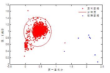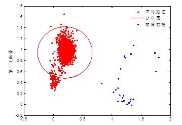 由圖2-4到圖2-6可以看出,在三個(gè)轉(zhuǎn)速范圍,故障數(shù)據(jù)的PCA降維結(jié)果與正常數(shù)據(jù)降維結(jié)果的分布有很大的差別,故障數(shù)據(jù)降維后的散點(diǎn)都落在分布圓外,可以實(shí)現(xiàn)正常數(shù)據(jù)與故障數(shù)據(jù)的分類。因此,結(jié)合PCA降維技術(shù),考慮風(fēng)電運(yùn)行工況,對(duì)風(fēng)電振動(dòng)數(shù)據(jù)進(jìn)行融合,獲得散點(diǎn)分布圓,可以有效的實(shí)現(xiàn)風(fēng)電設(shè)備的狀態(tài)監(jiān)測(cè)和故障診斷。