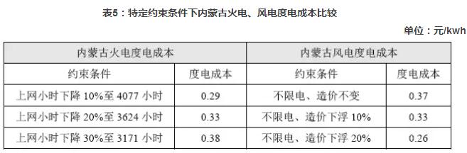 我國將力爭在2020年前根本性解決可再生能源消納問題,考慮到新能源技術(shù)進(jìn)度必然帶來成本的下降,西北部地區(qū)的風(fēng)電度電成本具備較大下降空間。而“十三五”期間我國將對“三北”地區(qū)1.33億千瓦熱電聯(lián)產(chǎn)機組進(jìn)行調(diào)峰性改造,西北部地區(qū)火電高利用小時數(shù)難以為繼。本文基于上述考慮,在特定約束條件下對內(nèi)蒙地區(qū)火電、風(fēng)電度電成本重新測算。經(jīng)測算,在火電利用小時數(shù)下降10%、風(fēng)電發(fā)電量全額消納、項目總造價下降10%的情景下,風(fēng)電的度電成本與火電相當(dāng)。