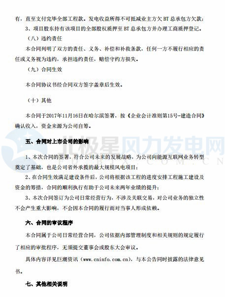 11 月16 日,哈爾濱九洲電氣股份有限公司與亞洲新能源(金湖)風(fēng)力發(fā)電有限公司簽署了關(guān)于《亞洲新能源金湖縣 100MW 風(fēng)電場 BT 總承包合同》,合同總價款 85,000 萬元;與亞洲新能源(寶應(yīng))風(fēng)力發(fā)電有限