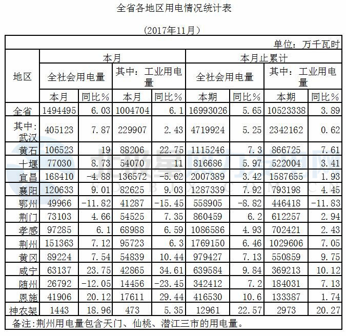 (五)全省各地區(qū)全社會用電絕大部分增長,工業(yè)用電起到重要拉動作用。全省14個用電統(tǒng)計地區(qū)中11個地區(qū)全社會用電不同程度增長,其中黃石、咸寧等4個地區(qū)全社會用電增幅超過兩位數(shù);武漢、襄陽等7個地區(qū)全社會用電平穩(wěn)較快增長。武漢市當(dāng)月全社會用電40.51億千瓦時,占全省用電量的27.11%,同比增長7.87%,高于全省平均水平1.84個百分點,起到重要穩(wěn)定和帶頭作用;從工業(yè)用電情況來看,黃石、十堰等5個地區(qū)用電呈兩位數(shù)以上增長,武漢、襄陽等6個地區(qū)平穩(wěn)較快增長。受當(dāng)?shù)禺a(chǎn)業(yè)結(jié)構(gòu)調(diào)整因素影響,宜昌、鄂州、隨州3地當(dāng)月全社會和工業(yè)用電出現(xiàn)下降。