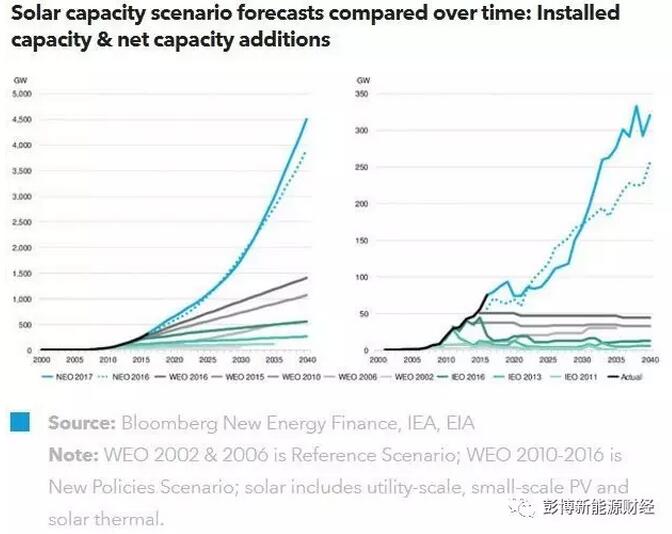2017年彭博新能源財(cái)經(jīng)新能源市場長期展望預(yù)測,光伏和光熱的總裝機(jī)將達(dá)4,506GW,而IEA報(bào)告則僅在“新政策情景”下,給出了1481GW的預(yù)測值。