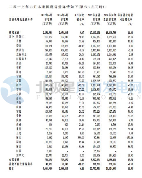龍源電力2017年6月完成發(fā)電量3,064,949兆瓦時, 同比增加6.11%,其中風電增加9.67%;截止6月底,龍源電力累積發(fā)電量22,732,356兆瓦時,同比增加11.30%,其中風電增加11.00%。以下為具體發(fā)電量數(shù)據(jù):