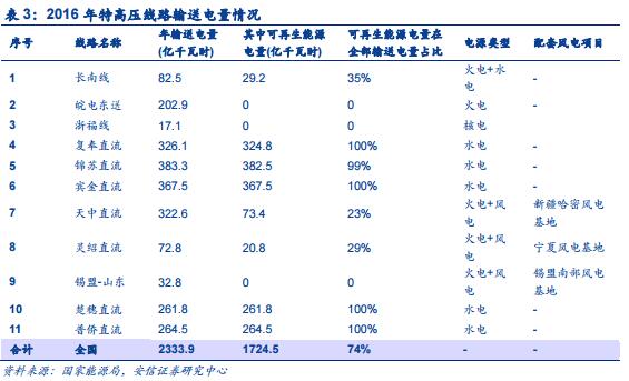 11 條特高壓線路中,三條特高壓線路針對風電消納問題配備了專門供電的風電場。其中,天中直流于 2014 年正式投運,主要針對新疆哈密地區(qū)風電消納問題,2016 年共運輸風電 73.4 億千瓦時,新疆地區(qū)全年風電發(fā)電量為 220 億千瓦時,特高壓輸電占新疆地區(qū)風電消納比例達到 33.36%;靈紹直流對接寧夏風電基地,于 2016 年正式投運,2016 年共運輸風電 20.8 億千瓦時,寧夏地區(qū)全年風電發(fā)電量為 129 億千瓦時,特高壓輸電占寧夏地區(qū)風電消納比例為 16.12%。錫盟-山東線于 2016 年投運,主要對接錫盟南部風電基地,目前還未進行風電輸送。