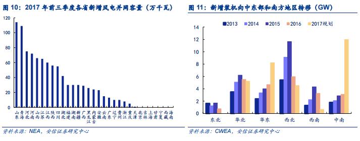 4)最后是風電建設向中東部和南部等消納能力強的地區(qū)轉移。風電“十三五”規(guī)劃提出, “十三五”期間“三北”地區(qū)在基本解決棄風問題的基礎上,通過促進就地消納和利用現(xiàn)有通道外送,新增風電并網裝機容量 35GW,累計并網容量達到 135GW,相比“十二五”同比增長 35%;中東部及南部地區(qū)新增并網容量 42GW,累計并網裝機容量達到 70GW,同比增長 150%。從 2017 年前三季度各省市新增并網容量來看,棄風限電嚴重的新疆(0.3GW)、甘肅(0)、寧夏(0)等地勢頭得到有效遏制,風電新增并網容量較多的地區(qū)為青海、山東、河南、河北等消納能力較強的省份。