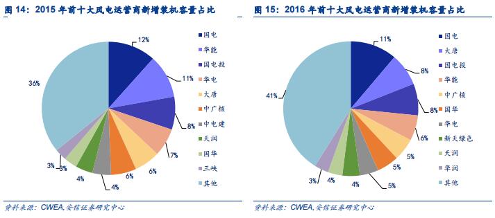 行業(yè)集中度下滑,投資主體多元化。由于風電一般單個項目規(guī)模較大,對資金規(guī)模及融資能力要求較高,國內風電開發(fā)主體為以五大發(fā)電集團(國電、華電、華能、大唐、國電投)為主的央企。2016 年,中國風電有新增裝機的開發(fā)商企業(yè)超過 100 家,前十家裝機容量超過 1300 萬千瓦,占比達到 58.8%,累計裝機前十家的開發(fā)企業(yè)裝機容量超過 1 億千瓦,占比達到 69.4%。但隨著風電行業(yè)的快速發(fā)展以及風電運營具備較好的經濟性,參與風電投資的企業(yè)越來越多,2016 年前十大開發(fā)企業(yè)市場份額同比下降 6.6%,且在 2016 年新增裝機容量的前十名中,民營企業(yè)數(shù)量從 2015 年的 1 家(天潤)增長至 2 家(天潤、新天綠色)。