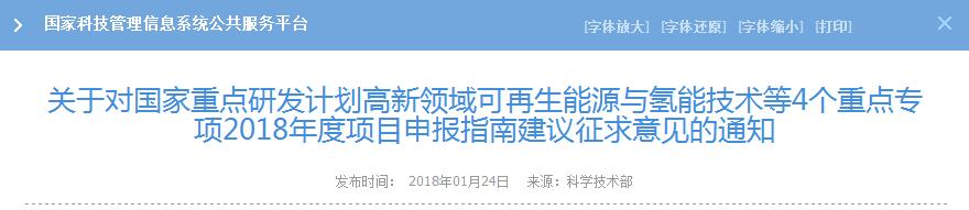 關(guān)于對(duì)國(guó)家重點(diǎn)研發(fā)計(jì)劃高新領(lǐng)域可再生能源與氫能技術(shù)等4個(gè)重點(diǎn)專項(xiàng)2018年度項(xiàng)目申報(bào)指南建議征求意見(jiàn)的通知
