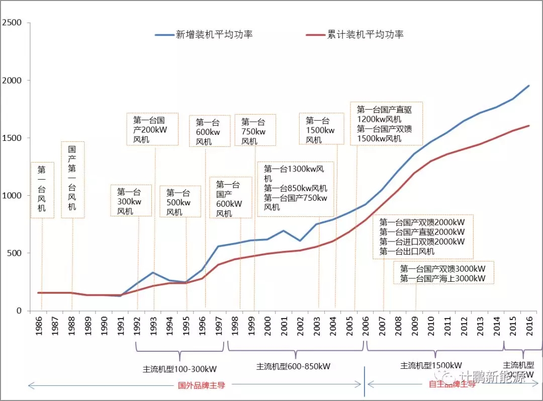 從風(fēng)電機(jī)組容量看,前10年我國風(fēng)電機(jī)組容量在300kW以內(nèi);中間10年機(jī)組容量主要為600-850kW;近10年主要為兆瓦級以上風(fēng)電機(jī)組。從機(jī)組品牌看,前10年基本屬于國外品牌的天下,中間10年自主品牌開始崛起,近10年自主品牌占絕對主導(dǎo)地位。