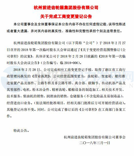 杭州前進(jìn)齒輪箱集團(tuán)股份有限公司日前發(fā)布消息稱,2018 年 2 月 28 日,公司完成相應(yīng)工商變更登記手續(xù),取得了浙江省工商行政管理局換發(fā)的《營業(yè)執(zhí)照》。