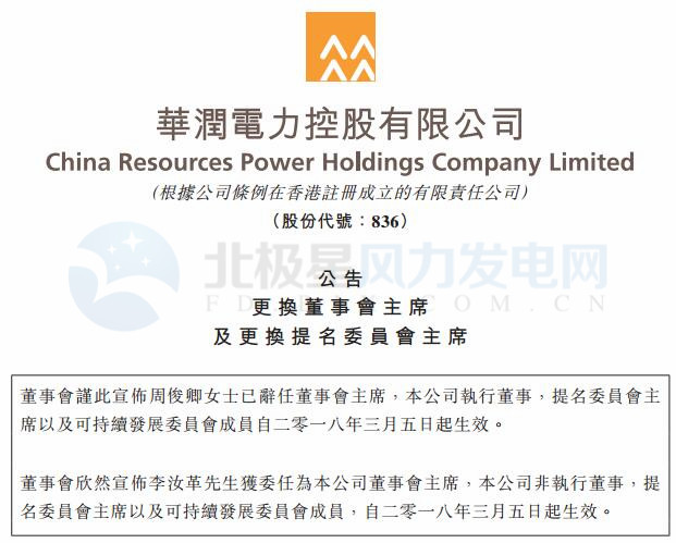 華潤電力稱,周俊卿女士已達(dá)退休年齡,將不再出任董事會主席,并已辭任本公司執(zhí)行董事、提名委員會主席以及可持續(xù)發(fā)展委員會成員,由李汝革先生接任,自2018年3月5日起已生效。