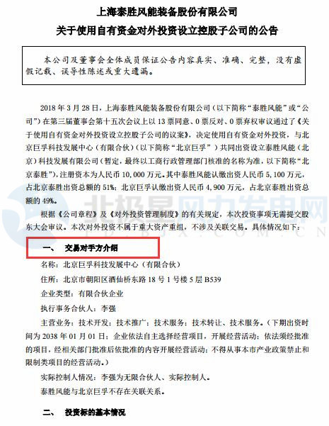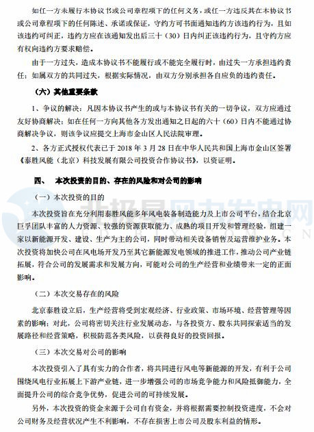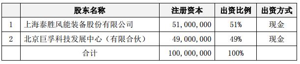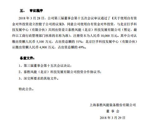 2018 年 3 月 28 日,泰勝風(fēng)能第三屆董事會第十五次會議審議通過了《關(guān)于使用自有資金對外投資設(shè)立控股子公司的議案》,決定使用自有資金對外投資,與北京巨孚科技發(fā)展中心(有限合伙)共同出資設(shè)立泰勝風(fēng)能(北京)科技發(fā)展有限公司,注冊資本為1億元( 10,000 萬元);其中泰勝風(fēng)能認(rèn)繳出資額人民幣 5,100 萬元,占出資總額的 51%。