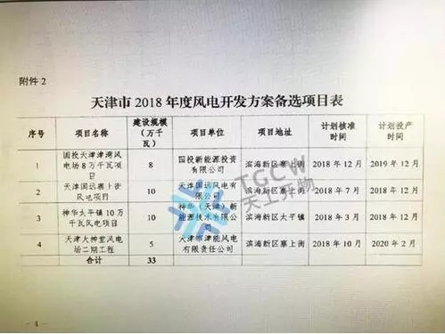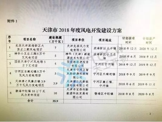 2018年:6個風電項目列入天津市2018年度風電開發(fā)建設(shè)方案,總裝機35.9萬千瓦。同時安排4個風電開發(fā)備選項目,總裝機33萬千瓦。