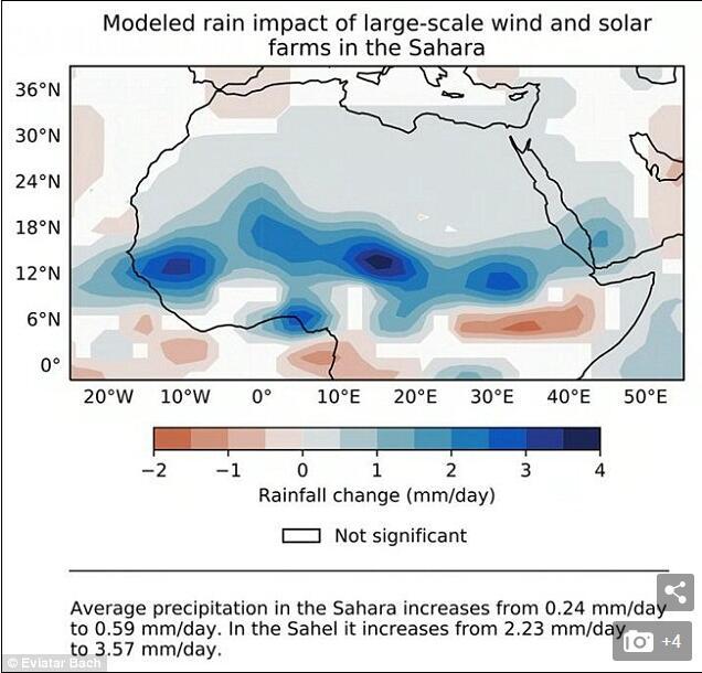 覆蓋廣闊地區(qū)的裝置可以滿足歐洲、中東和非洲的能源需求,以及增加降雨量,最終促進(jìn)植物生長(zhǎng)。