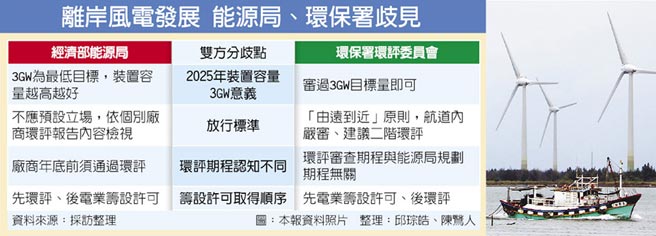 離岸風電環(huán)評陸續(xù)展開,開發(fā)商年底前須通過環(huán)評,隨著個別開發(fā)案環(huán)評進行,經濟部、環(huán)保署不同調情形有加劇趨勢,雙方對于目標裝置容量、環(huán)評放行標準、環(huán)評期程和環(huán)評、電業(yè)籌設許可取得順序都出現分歧