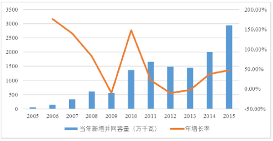 全國2005 年至2015 年風(fēng)電歷年新增并網(wǎng)容量及年增長率